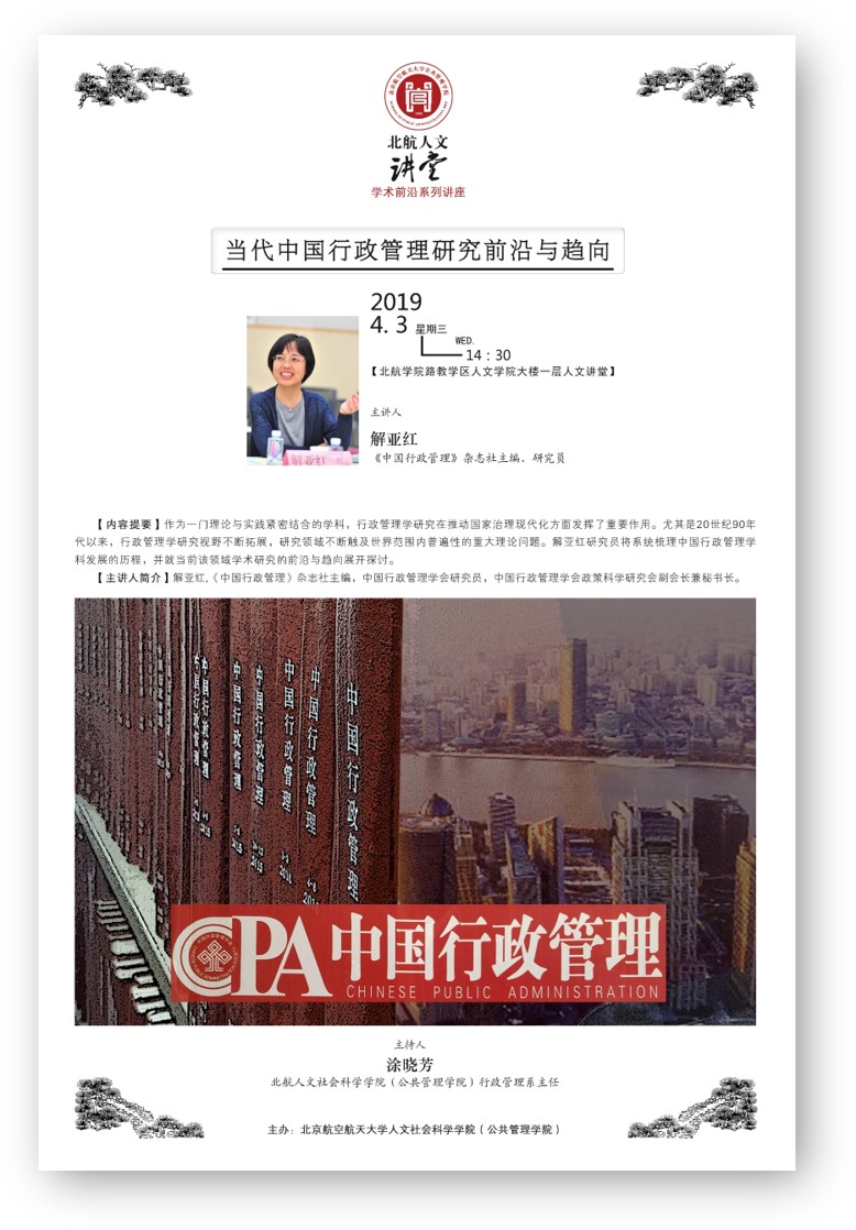 4月3日下午,“北航人文讲堂”举行了题为“当代中国行政管理研究前沿与趋向”的学术讲座。讲座由北航人文社会科学学院行政管理系主任涂晓芳主持。涂晓芳主任首先介绍了主讲人,《中国行政管理》杂志社主编、中国行政管理学会研究员、中国行政管理学会政策科学研究会副会长兼秘书长解亚红研究员。