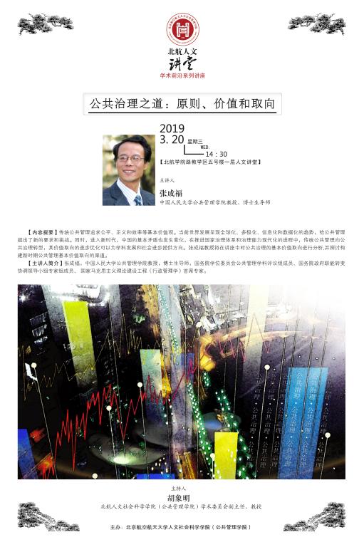 “北航人文讲堂”首场学术前沿讲座,邀请到中国人民大学公共管理学院张成福教授做题为“公共治理之道——原则、价值和取向”的学术报告,学院师生近200人聆听了讲座。报告会由人文社会科学学院(公共管理学院)学术委员会副主任胡象明教授主持。