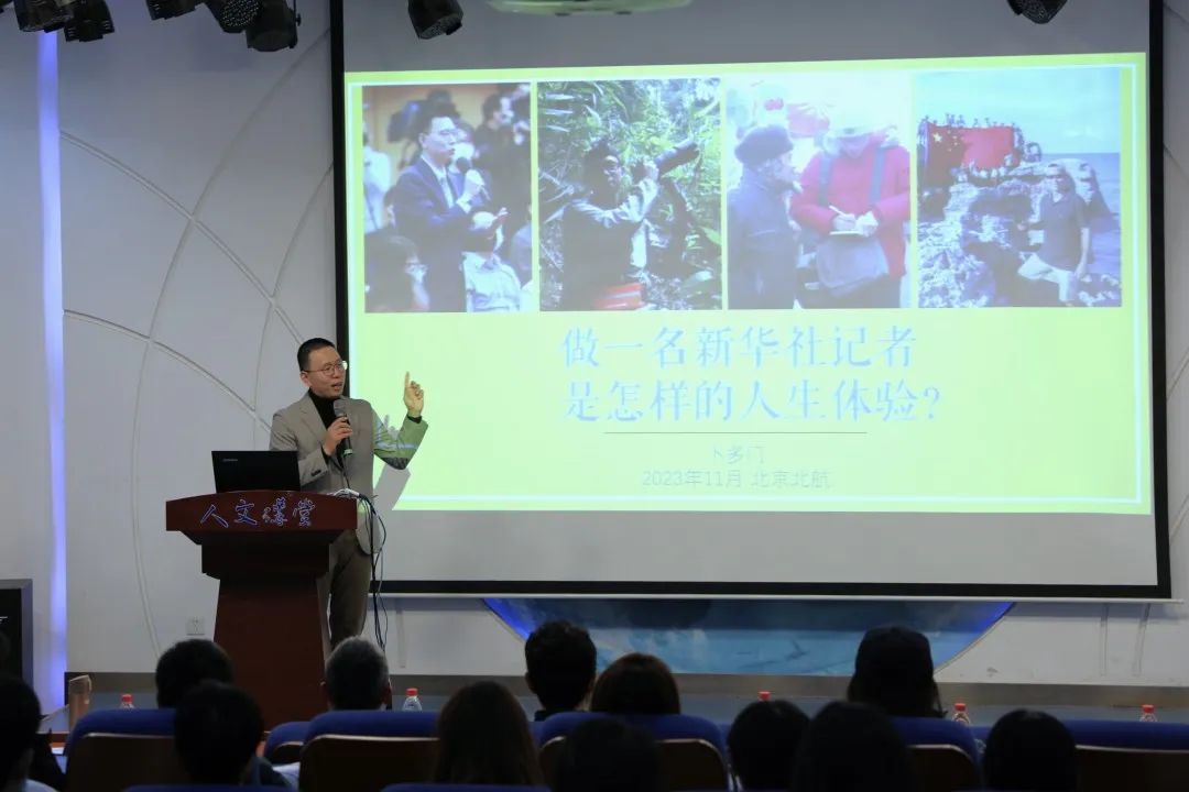 11月15日下午,由新华社人事局、北航学生就业指导服务中心和北航人文社会科学学院(公共管理学院)联合主办的新时代国家通讯社的职责与使命暨新华社进北航校园招聘宣讲会在北航人文公管学院楼一层人文讲堂成功举办。新华社人事局总社人事处处长周文帅、干部徐伟峰,摄影部新媒体采编室主任费茂华、技术局程控电话部副主任苏宇、对外部阿文编辑室主任编辑卜多门、国内部央采中心科技室记者胡喆;北航人文公管学院院长蔡劲松、副院长陈文博、党委副书记方志、专职辅导员张同玉,以及本研学生参加。
