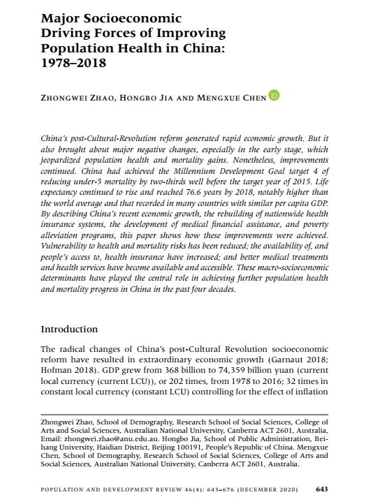 近日,我院贾洪波教授与澳大利亚国立大学(ANU)Zhongwei Zhao教授以及Mengxue Chen博士生在国际一流SSCI期刊Population and Development Review(PDR)合作发表题为Major socioeconomic driving forces of improving population health in China: 1978-2018(http://dx.)的学术论文。