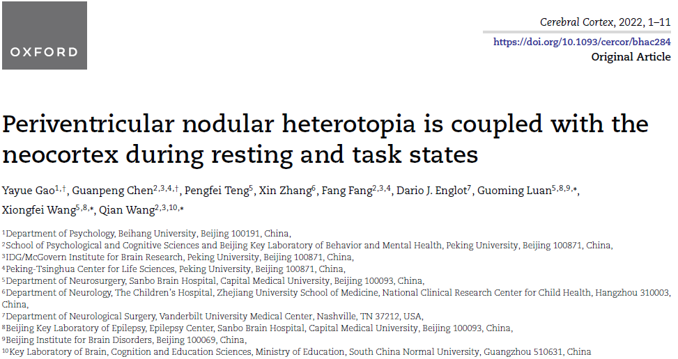 近日,我院高雅玥助理教授在期刊《CEREBRAL CORTEX》(影响因子4.86,中科院一区Top期刊)合作发表题为Periventricular nodular heterotopia is coupled with the neocortex during resting and task states的学术论文(http://doi.org/10.1093/cercor/bhac284)。本篇论文揭示了异位的灰质组织与正常皮层功能连接的时空特性,并提出了神经元迁移异常后共同发育的假说。