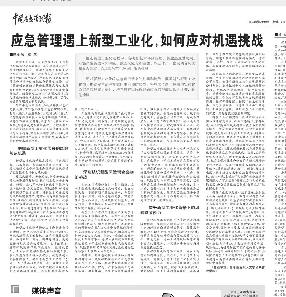 近日,北京伊人99公共管理学院副院长詹承豫教授和研究生滕欢同学于《中国应急管理报》发表“应急管理遇上新型工业化,如何应对机遇挑战”一文,以下为文章全文。