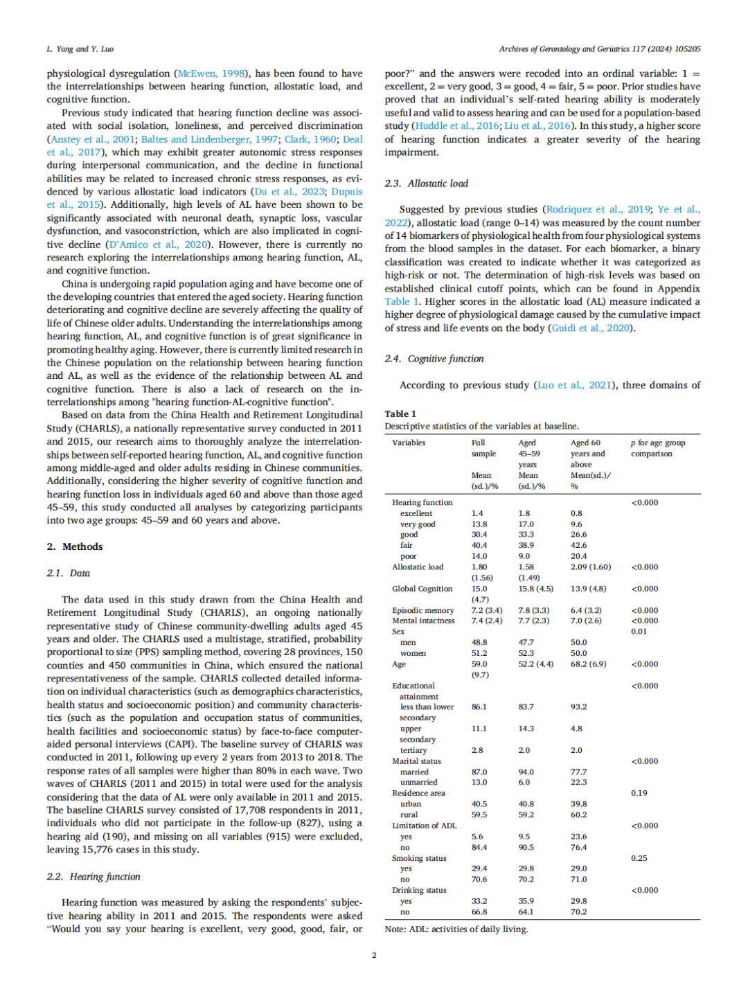 近日,北京伊人99人文社会科学学院(公共管理学院)杨磊副教授与北京大学公共卫生学院罗雅楠副研究员合作的文章《The interrelationships of hearing function,allostatic load,and cognitive function: Evidence among middle-aged and older Chinese adults》在SSCI期刊《Archives of Gerontology and Geriatrics》上发表,以下为文章全文。
