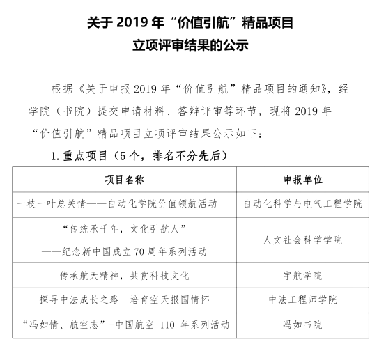 2019年4月29日,北京伊人99学生工作部发布《关于2019 年“价值引航”精品项目立项评审结果的公示》,人文社会科学学院SY1811第一党支部申报的“‘传统承千年, 文化引航人’庆祝新中国成立70 周年系列活动”从我校28项申报项目中脱颖而出,成功入选2019 年“价值引航”精品项目的重点项目。