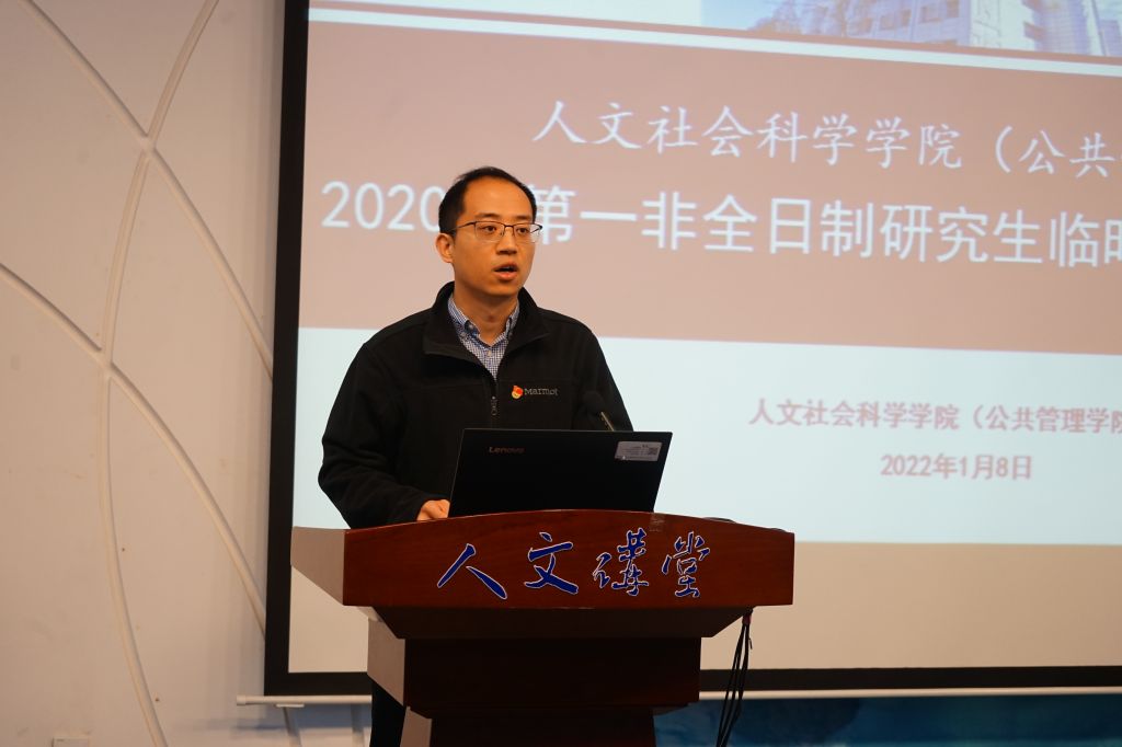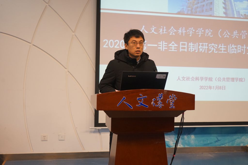 1月8日上午,人文公管学院2020级第一非全日制研究生临时党支部(以下简称“第一临时党支部”)成立大会在人文讲堂召开。学院党委书记王琪全,党委研究生工作部副部长王扬,学院党委副书记张驰,MPA班主任代表韩梦出席大会,会议由专职辅导员张同玉主持,2020级MPA非全日制研究生党员代表参加会议。
