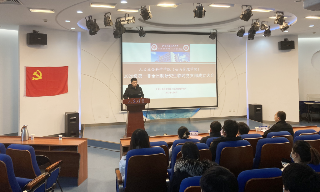 会议在庄严肃穆的《国际歌》中拉开序幕。首先,王扬副部长对非全日制研究生临时党支部成立的背景、主要职责、未来目标和条件保障进行了详细介绍。他强调,成立临时党支部的工作目标在通过支部建设,发挥教育引领作用,提升同志们对北航的认同感,打造甘于奉献、高素质的党员队伍,传承爱国奉献、敢为人先、团结拼搏、担当实干的空天报国精神;发挥临时党支部战斗堡垒作用,提升组织的凝聚力,带动班风、学风和院风建设;发挥非全日制学生党员的行业资源优势,促进支部共建,实现学生群体的成长进步。