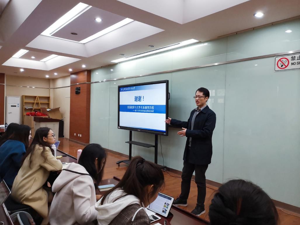 2018年11月05日星期一上午十点,我院学术部在院楼202教室成功举办题为《英国政府与大学关系演变历程——基于大学合法性地位获取的角度》的讲座,主讲人是北航高等教育研究院的冯磊博士。冯磊博士一开讲就带出了浓厚的学术气息,他用通俗的语言使同学们更加深入地理解讲座的内容。