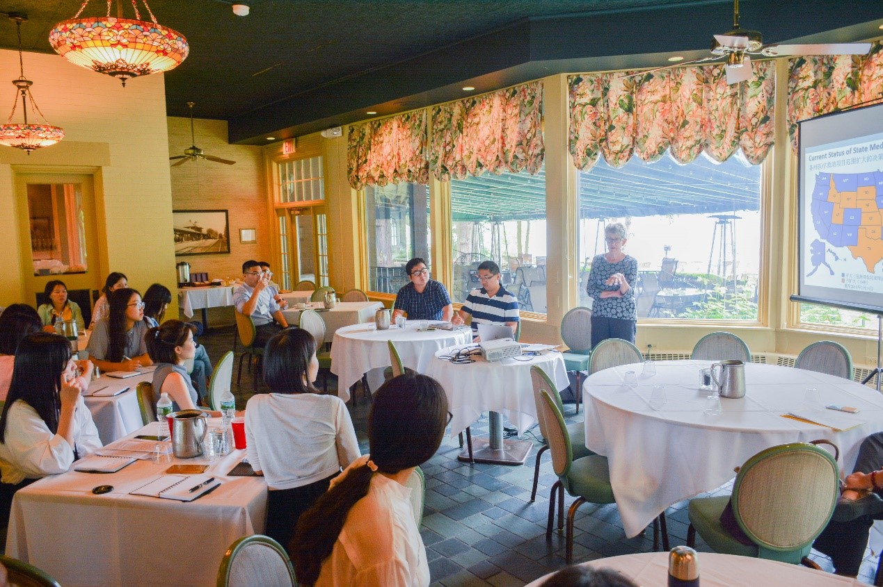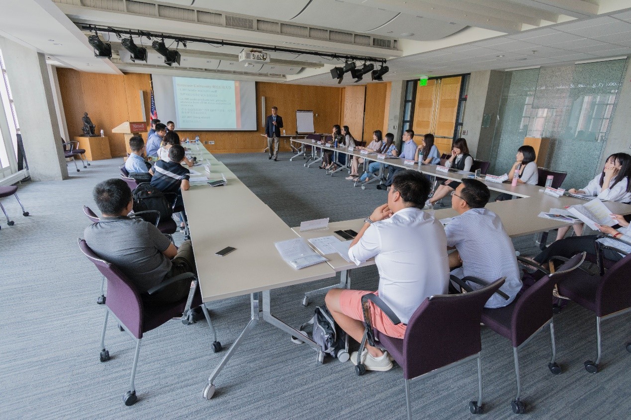 接下来,在李亚老师和童海燕老师的陪同下,雪城大学马克斯韦尔公民与公共事务学院高级公共管理教育主任Steve Lux教授对同学们的到来致欢迎词,师生互做自我介绍,教授详细介绍了锡拉丘兹市和雪城大学的成立背景、历史文化、教育教学、师资与校友以及本次项目的目标和主要内容。宾至如归的热情、一问一答的解惑、和谐而亲切的互动,使同学们初到美国的陌生逐渐在欢声笑语中消散。