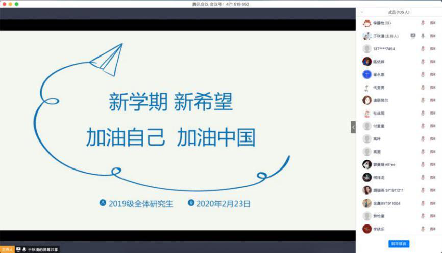 2月23日,2019级研究生2019-2020学年春季学期第一次线上班会召开,104名研究生出席,班会由辅导员于秋漫主持。本次班会围绕着“新学期·新形势·新学风”的主题,分“严守规章”、“科学防控”、“积极学习”、“参与活动”四部分内容展开。疫情当前,责任在肩。人文社会科学学院积极开展落实首日教育,将坚持做好各项疫情防控工作,扎实做好线上教学和科研工作,创新开展思政教育工作,凝聚起众志成城、全力以赴、共克时艰的强大力量,坚决打赢疫情防控阻击战。