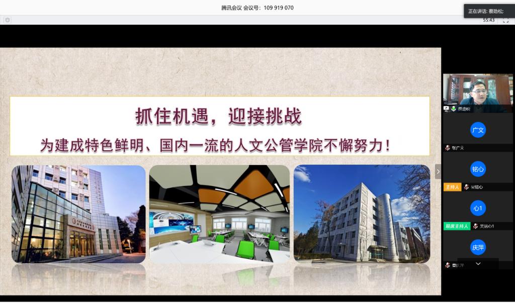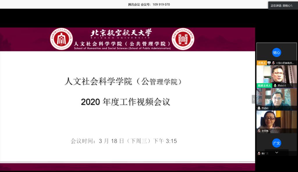 3月18日下午,人文社会科学学院(公共管理学院)以视频会议的方式召开2020年度工作会。院领导班子成员、全体教职工参加本次会议。会议由吴铭心副院长主持。