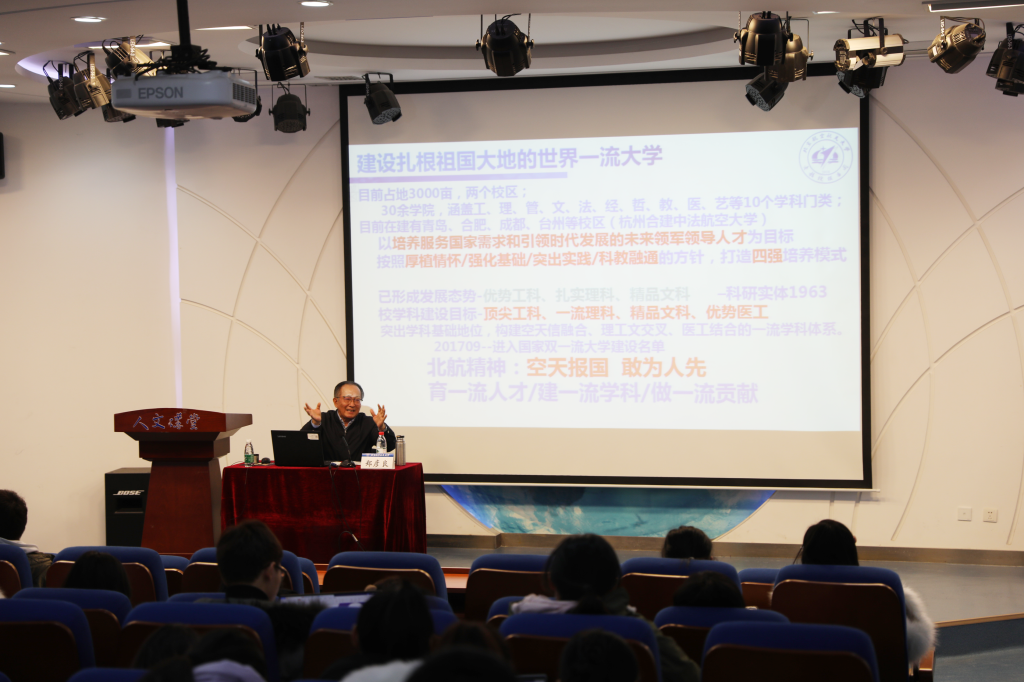 活动中,郑教授向同学们传递了杰出北航人的卓越品质,满怀深情地讲述了航空报国英雄楷模罗阳的事迹,郑教授为纪念罗阳的文章《一个北航普通学生的璀璨人生》中写道:“他是最让我们骄傲的学生,他是最让我们心疼的学生!”,他的纯粹,他的学习态度,他对祖国航空事业30年的坚守,是对北航校训“德才兼备 知行合一”的完美体现,祖国终将选择那些忠诚于祖国的人,祖国终将记住那些奉献于祖国的人。同时,告诉同学们北航人的精神是代代相传的,流体力学家、航空教育家、社会活动家陆士嘉先生,中国航空之父冯如,北航楷模杨为民,以及耐得寂寞、一辈子只干一件事的苏东林院士,他们身上沉淀的北航精神,值得同学们用一生去感悟,去学习!