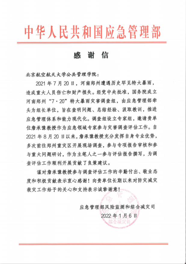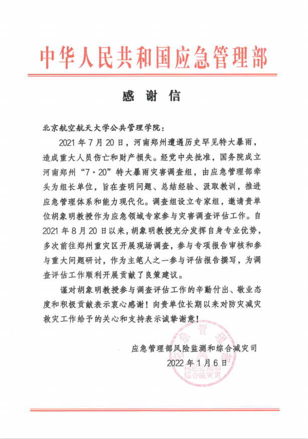 近日,北京伊人99公共管理学院收到来自应急管理部风险监测和综合减灾司的两封感谢信。感谢我院胡象明教授和詹承豫教授参与河南郑州“7·20”特大暴雨灾害调查的辛勤付出、敬业态度和积极贡献,感谢我院长期以来对防灾减灾救灾工作给予的关心和支持。