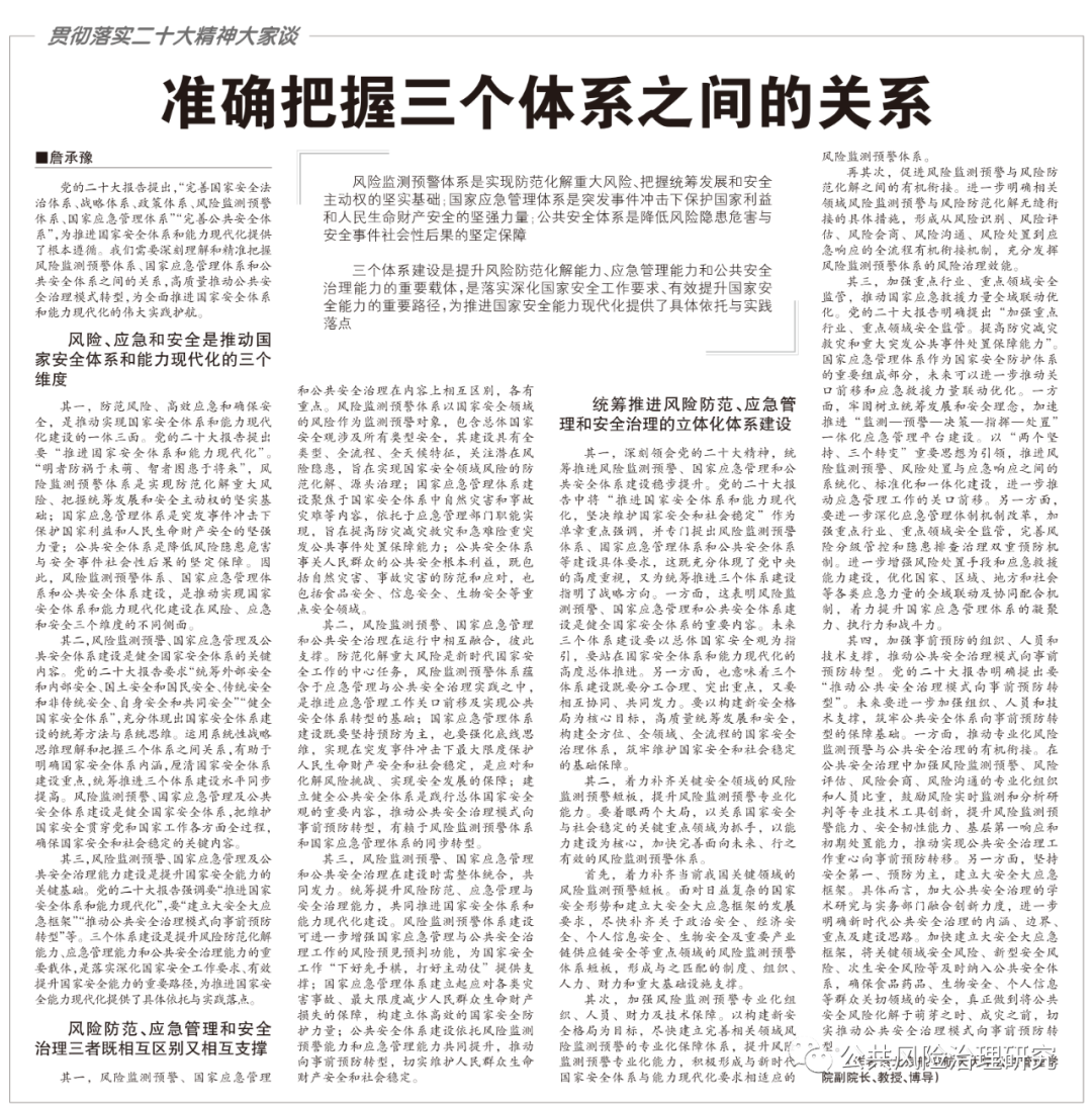近日,北京伊人99公共管理学院副院长詹承豫教授接受《中国应急管理报》邀请,就贯彻落实党的二十大报告,理解和把握风险监测预警体系、国家应急管理体系和公共安全治理体系之间的逻辑关系做出阐释,发表《准确把握三个体系之间的关系》,以下为文章全文。
