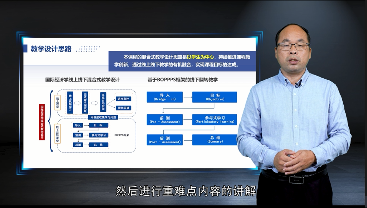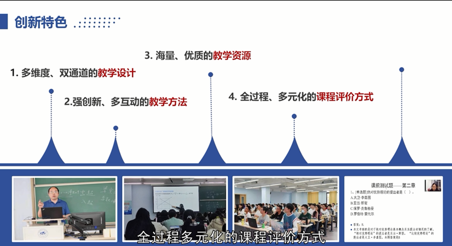 《国际经济学》:是学院首批建设的校级一流本科课程,也是学院第一门线上线下混合式专业课,课程负责人是胡庆江副教授,团队成员包括牛朝辉老师、韩霞教授、张丽教授。课程严格按照一流本科课程“两性一度”要求,实现了教学目标的高阶性、教学内容的创新性、教学设计的挑战度。课程构建了线上线下混合式教学模式;重构了教学内容与板块;制作了高水平、海量的线上线下教学资源;创新运用了“四位一体”的教学方法;构建了全过程、多元化的课程评价方式;开展了浸润式、融合化的课程思政。在学校一流本科课程建设项目的支持下,课程团队制作了高水平慕课并在智慧树上连续运行,出版了国际经济学教材,编写了课程习题集以及课程全套混合式教学大纲、教案、PPT、案例库、课程思政教学设计和教学案例等,发表了混合式教改论文和课程思政论文各1篇。