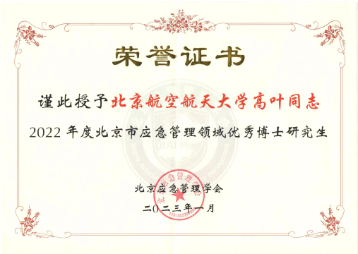 近日,北京应急管理学会组织开展了“2022年度北京市应急管理领域优秀研究生”评选工作,北航公共管理学院应急管理专业2021级博士研究生高叶获评“2022年度北京市应急管理领域优秀博士研究生”。