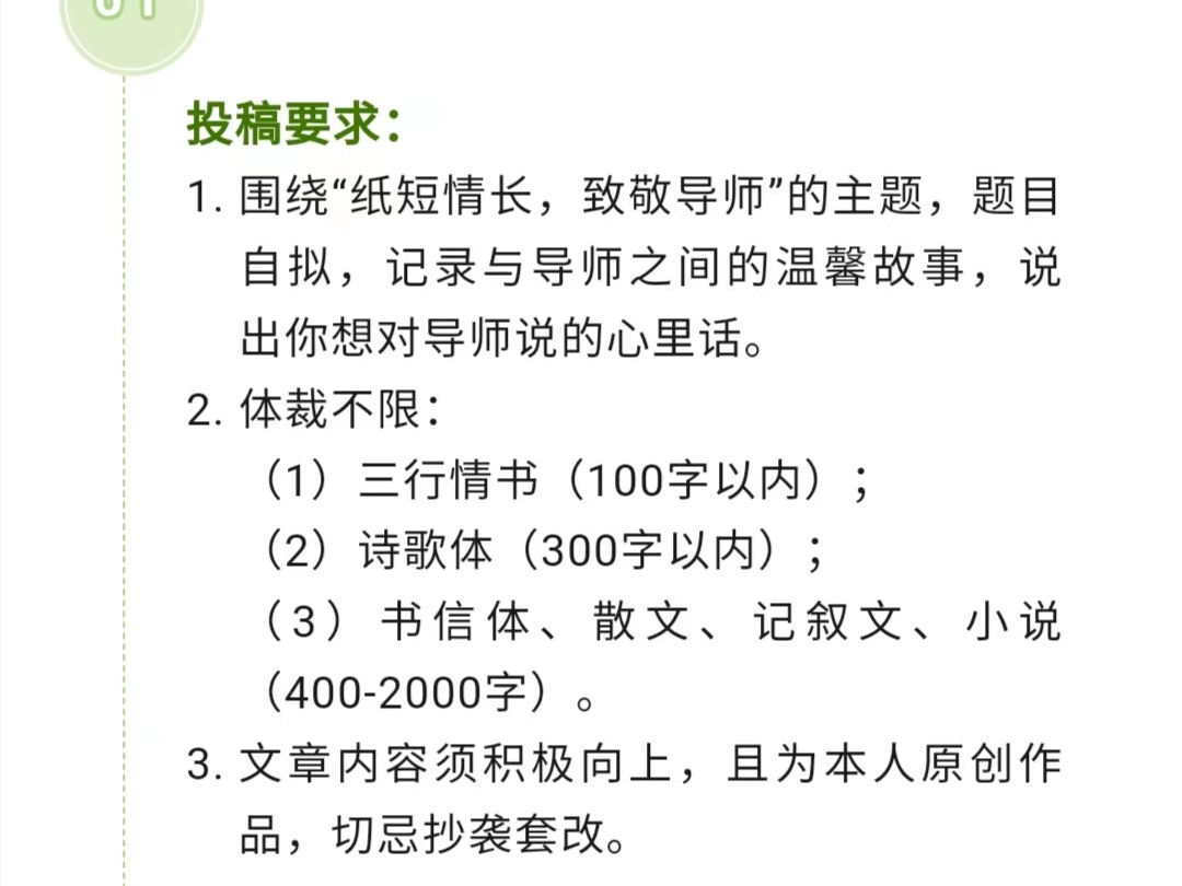 “重‘心’出发”系列活动,培育积极心理品质、构建良好导学关系。举办心理健康知识竞赛,普及心理健康知识,提高心理调适技能,树立积极的心理健康意识;开展“纸短情长”导学征文活动,字里行间展示人文情怀,学习之余表达对老师的感恩之情。