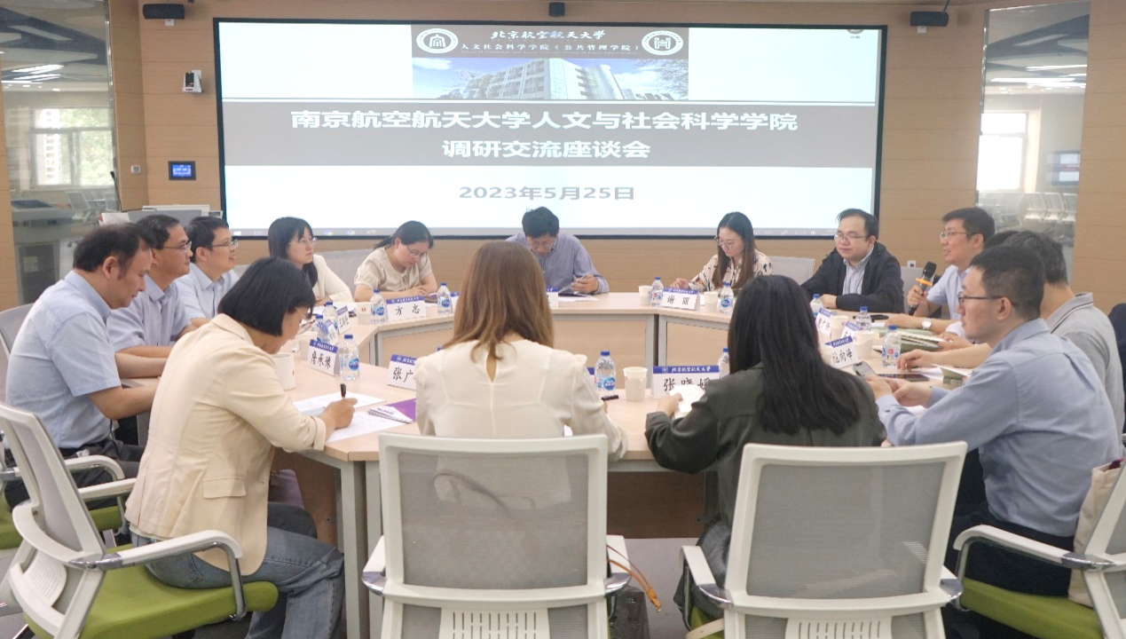 2023年5月25日,南航人文与社会科学学院一行来学院进行主题教育调研交流。南京伊人99人文与社会科学学院楚广兴书记、高志宏院长、施向峰副院长等领导和教师代表同我院王琪全书记、蔡劲松院长、詹承豫副院长、方志副书记等学院领导和教师代表进行深入交流座谈,座谈会由蔡劲松院长主持。