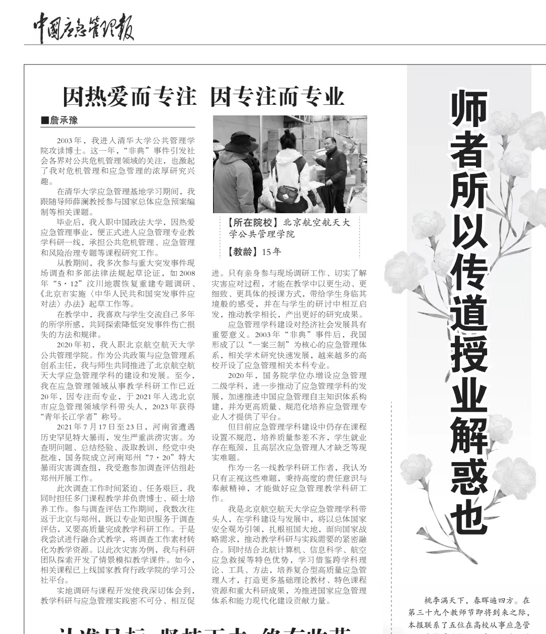 作为一名一线教学科研工作者,我认为只有正视这些难题,秉持高度的责任意识与奉献精神,才能做好应急管理教学科研工作。