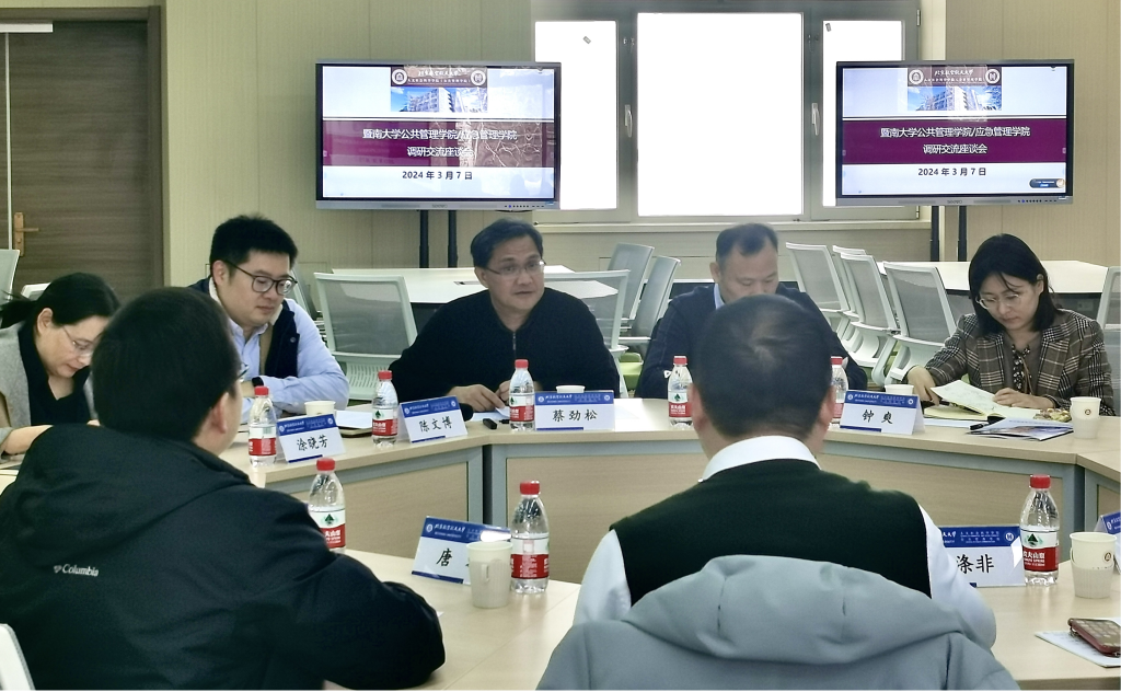 3月7日,暨南大学公共管理学院/应急管理学院院长戴胜利、副院长胡涤非、副院长兼应急管理系主任唐攀、行政管理系主任王子成、教授颜昌武、副教授祝哲一行访问我院。人文公管学院院长蔡劲松、副院长陈文博、副院长詹承豫、行政管理系主任涂晓芳,公共政策与应急管理研究所所长钟爽出席座谈会,座谈会由人文公管学院院长蔡劲松主持。