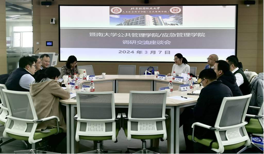 会谈中,双方围绕“博士招生质量和培养质量“”应急管理研究方向的实践逻辑“”深入实践前沿“”硕博培养方案相关经验“等方面展开热烈讨论。蔡劲松院长指出,学科发展要聚焦国家治理体系和治理能力现代化,探索有组织的新文科科研创新,创新“四维“公管人才培养目标,深化”学科育人、以文化人、通专融合、科教聚合“人才培养路径。此外,北航人文公管学院也将继续加强公共管理新型智库建设,打造具有北航特色的国家决策咨询高地。