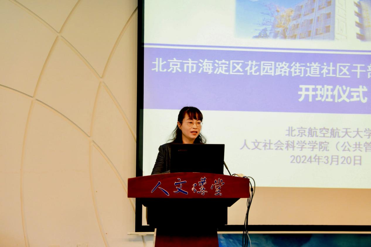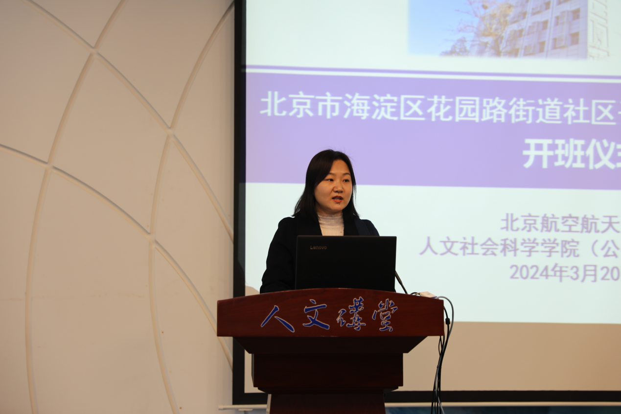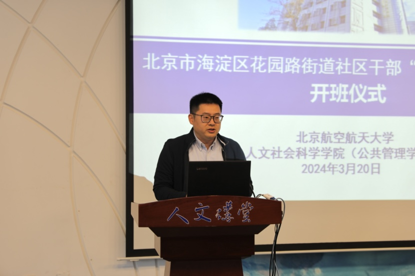 花园路街道党工委副书记李江、党群工作办公室副主任梁微霞、社区建设办公室四级主任科员陈慧,北航人文公管学院院长蔡劲松、党委书记王琪全、副院长陈文博,首期“优才计划”授课教师任丙强、李亚、涂晓芳,首期“优才计划”授课教师、班主任刘亚娜,副班主任赵丽鹏、教务老师张清,以及首期“优才计划”共48名学员参加开班仪式。开班仪式由人文公管学院陈文博副院长主持。