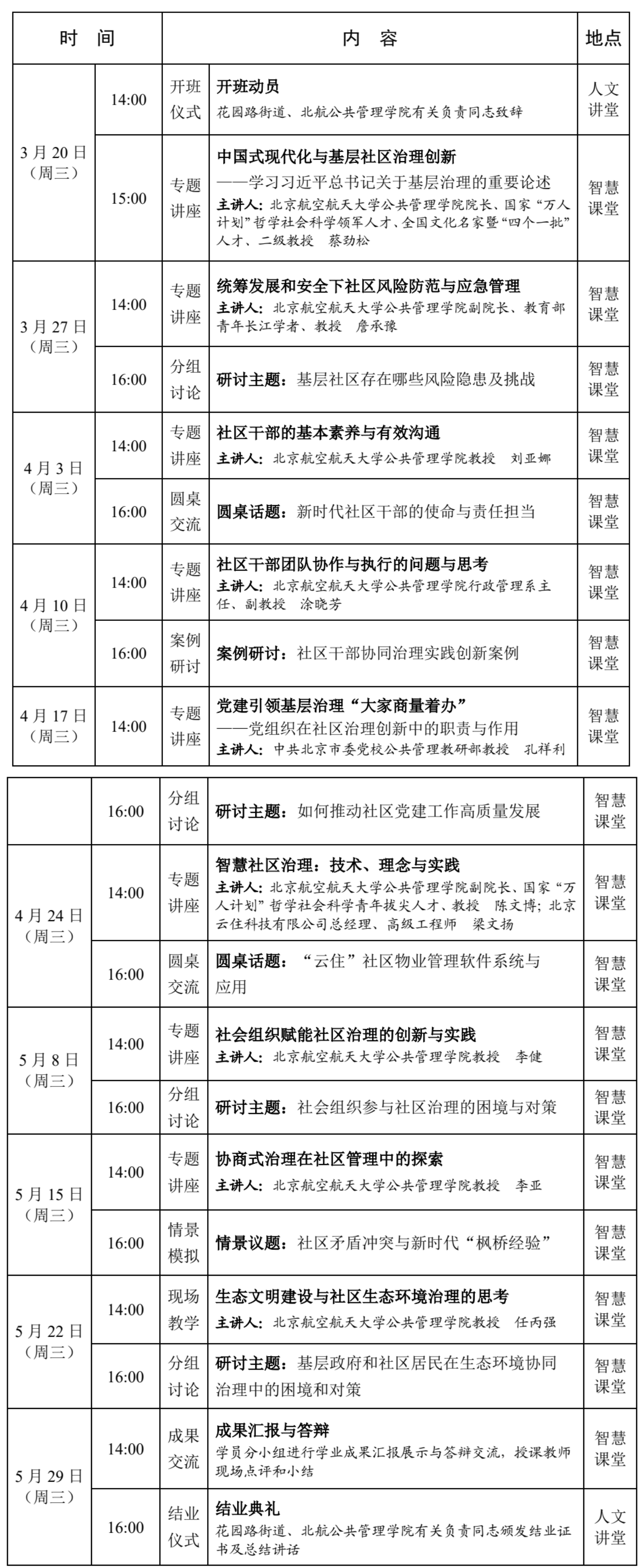 据悉,本次社区干部“优才计划”培训班从即日起正式开班,将历时2个半月,主要依托北航人文公管学院公共管理学一级学科的雄厚师资力量,同时汇聚其他相关学科领域学者、公共治理部门领导以及技术行业领域专家等资源,结合首都超大城市基层治理实践创新和社区治理的重点难点问题,综合运用多种教学方式,为基层政府治理能力和社区干部的综合素质提升提供智力支撑和培训服务。