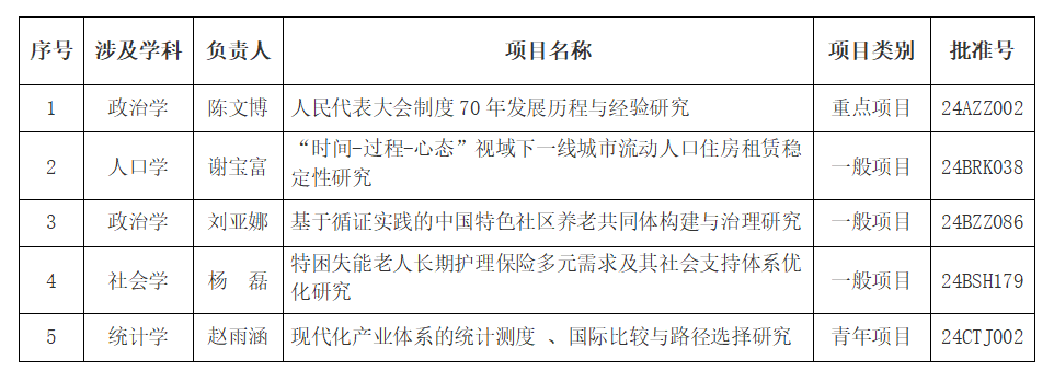 近日,全国哲学社会科学工作办公室公布2024年国家社科基金年度项目立项结果,我院一举获批5个项目,为近年来历史新高。获批项目包括重点项目1项:陈文博教授主持的“人民代表大会制度70年发展历程与经验研究”;一般项目3项:谢宝富教授主持的“时间-过程-心态”视域下一线城市流动人口住房租赁稳定性研究、刘亚娜教授主持的“基于循证实践的中国特色社区养老共同体构建与治理研究”、杨磊副教授主持的“特困失能老人长期护理保险多元需求及其社会支持体系优化研究”;青年项目1项:赵雨涵老师主持的“现代化产业体系的统计测度 、国际比较与路径选择研究”。