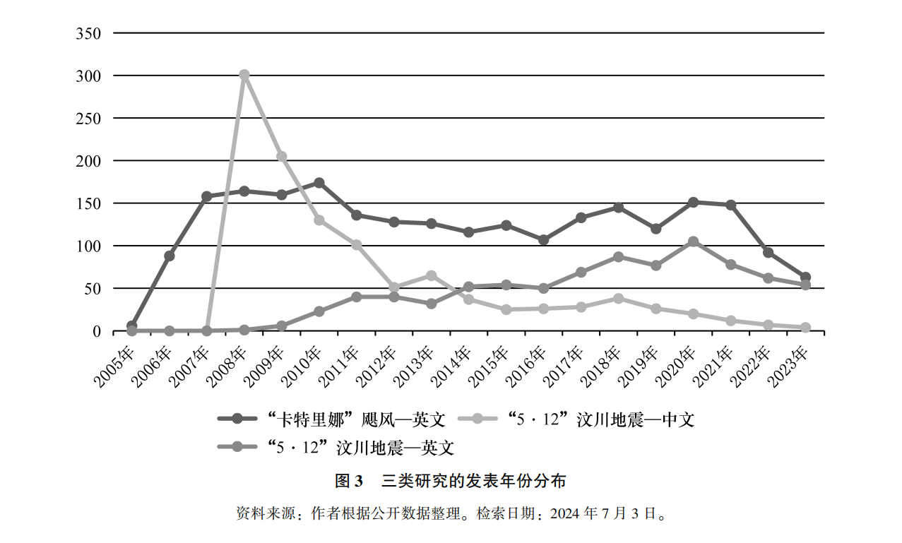其次,图3对比了三类研究的发表年份分布。从中可以发现,中文和英文学术界对经典案例的分析研究呈现不同的时间分布。简单来说,中文学术界的研究呈现迅速达峰、快速递减的总体趋势;英文学术界的研究则在时间分布上呈现出逐渐累积,存在明显“平台”期的总体特征。在具体分布中,中文学术界对“5·12”汶川地震的研究在2008年就达到了301篇的峰值。英文学术界对“卡特里娜”飓风的研究于2010年左右达到顶峰,对“5·12”汶川地震的研究则于2020年左右才达到顶峰,均与灾害事件发生有明显时间差。这初步勾勒出应急管理研究中经典案例分析两种具有一定差异的路径。