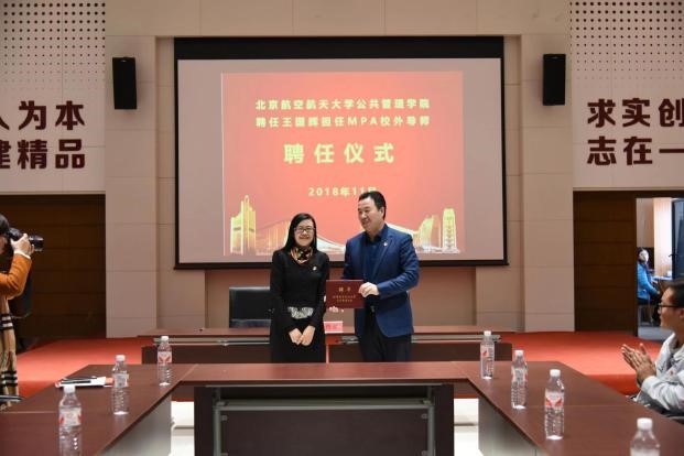 签约仪式结束后,北航公共管理学院聘请北安集团党委书记、副董事长王国辉为MPA校外导师,并由北航人文学院李亚梅书记为王书记颁发聘书。王国辉书记作为我院的杰出校友,多年来为我院发展建言献策,本次聘请他为MPA校外导师,将重点在人才培养和专业实践方面,与学院共同打造具有科研创新能力和专业实践能力的综合性人才。