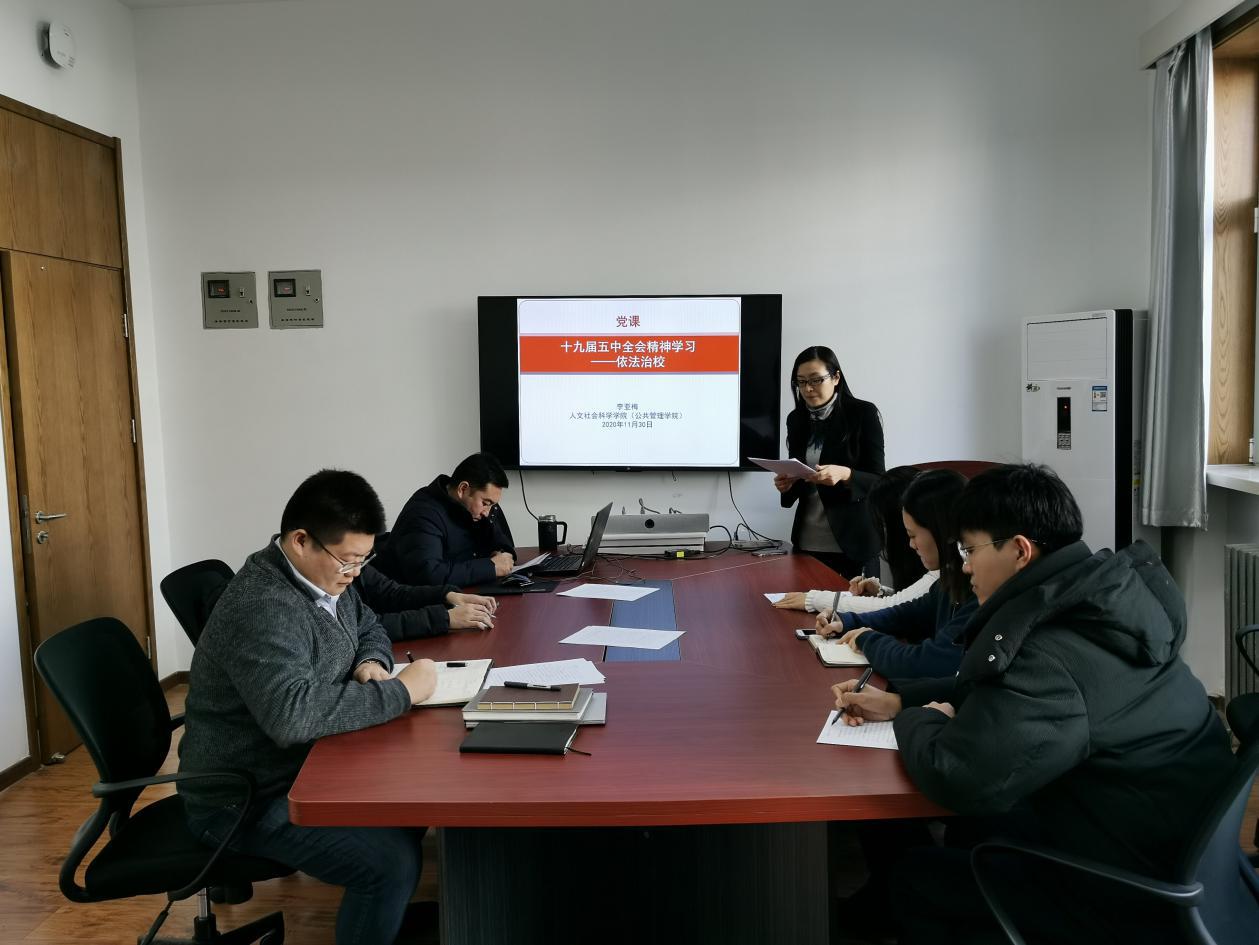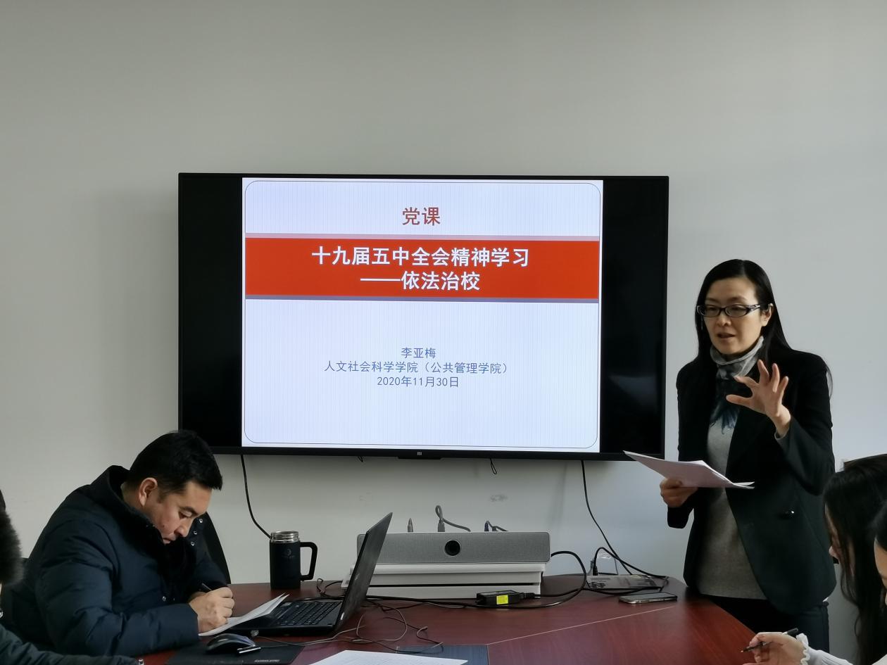 为深入学习贯彻党的十九届五中全会精神,落实依法治校新要求,11月30日上午,人文社会科学学院“十九届五中全会精神学习——依法治校”党课顺利开展。党课由学院分党委书记李亚梅教授主讲,院党委副书记张驰、学生工作办公室成员参加学习。